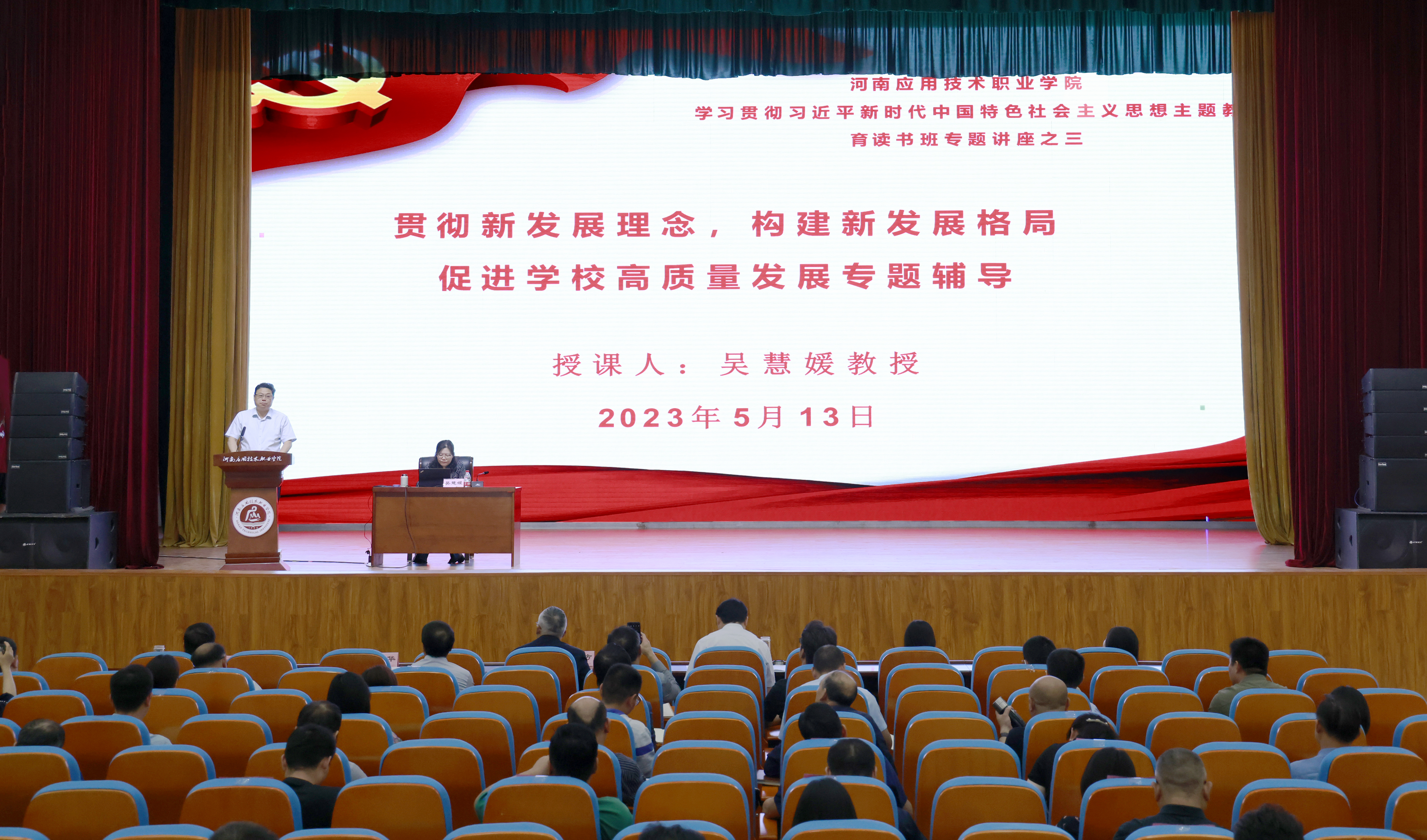 为深入推进学习贯彻习近平新时代中国特色社会主义思想主题教育,贯彻新发展理念,构建新发展格局,促进学校高质量发展,5月13日上午,党委理论学习中心组召开集体(扩大)学习会,邀请无锡职业技术学院副院长吴慧媛教授来校作专题辅导报告。全体在校领导班子及中层干部参加报告会,报告会由副校长魏新华主持。