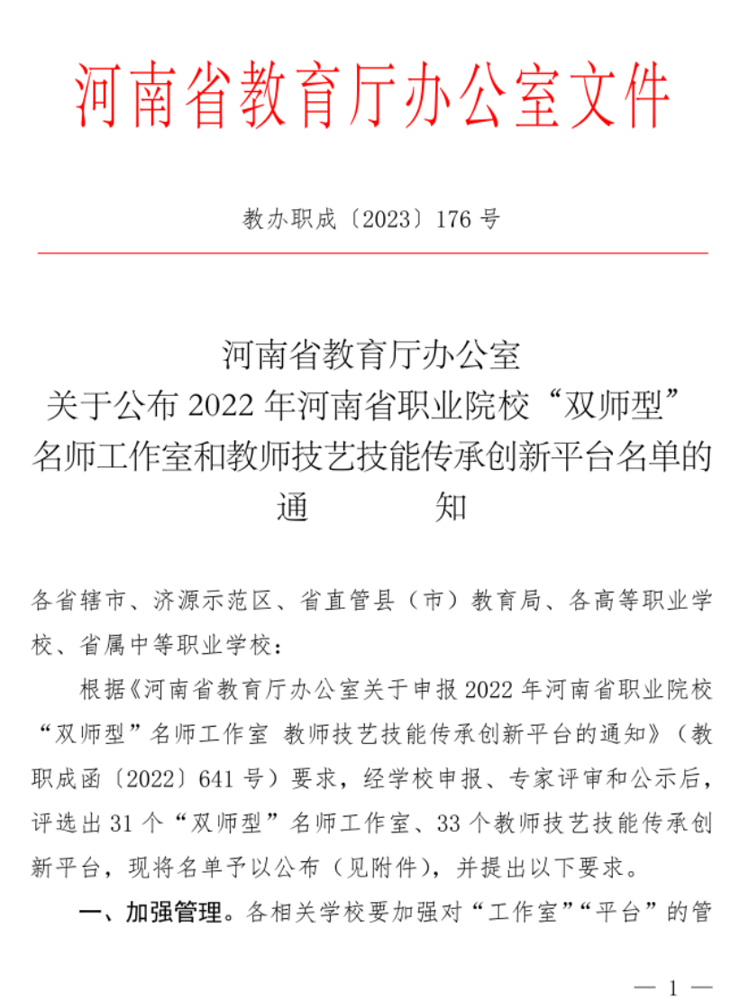 河南省职业院校“双师型”名师工作室和教师技艺技能传承创新平台团队的申报、评选,是省教育厅贯彻落实《教育部 河南省人民政府关于深化职业教育改革推进技能社会建设的意见》(豫政〔2021〕2号)等文件精神的举措,旨在着力强化职业院校名师团队培育工作,不断提高教师教育教学水平,促进我省职业院校教师队伍建设。