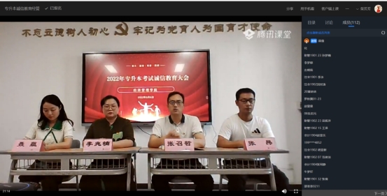 为提高2022届专升本考生诚信意识,培养考生诚信品质,营造诚信、自律、自强校园文化氛围,2022年6月6日下午,经济管理学院通过腾讯课堂召开2022年专升本考试诚信教育大会。165名专升本考生参加会议,会议由聂蕴主持。