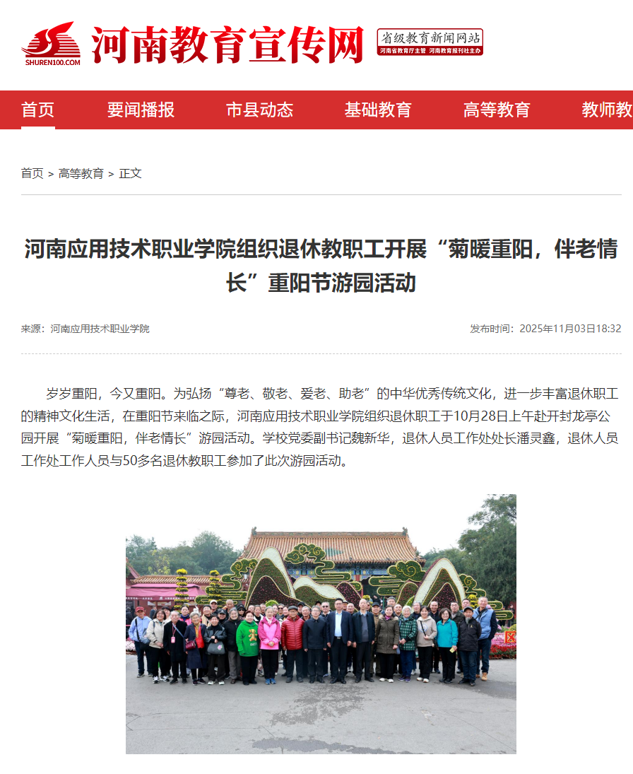 岁岁重阳,今又重阳。为弘扬“尊老、敬老、爱老、助老”的中华优秀传统文化,进一步丰富退休职工的精神文化生活,在重阳节来临之际,9428cn太阳集团组织退休职工于10月28日上午赴开封龙亭公园开展“菊暖重阳,伴老情长”游园活动。学校党委副书记魏新华,退休人员工作处处长潘灵鑫,退休人员工作处工作人员与50多名退休教职工参加了此次游园活动。