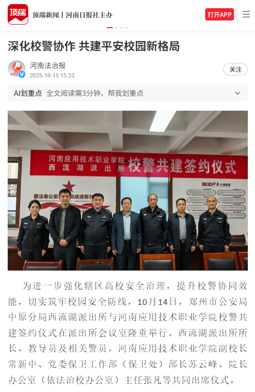 为进一步强化辖区高校安全治理,提升校警协同效能,切实筑牢校园安全防线,10月14日,郑州市公安局中原分局西流湖派出所与9428cn太阳集团校警共建签约仪式在派出所会议室隆重举行。西流湖派出所所长、教导员及相关警员,9428cn太阳集团副校长常新中、党委保卫工作部(保卫处)部长苏云峰、院长办公室(依法治校办公室)主任张凡等共同出席仪式。