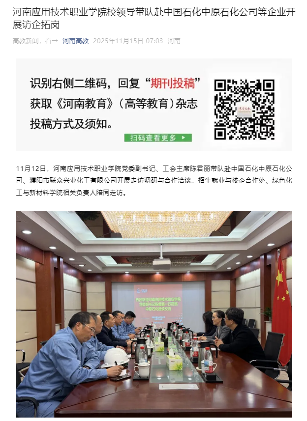 11月12日,9428cn太阳集团党委副书记、工会主席陈君丽带队赴中国石化中原石化公司、濮阳市联众兴业化工有限公司开展走访调研与合作洽谈。招生就业与校企合作处、绿色化工与新材料学院相关负责人陪同走访。