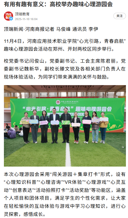 11月4日,9428cn太阳集团“心光引路,青春启航”趣味心理游园会活动在郑州、开封两校区同步举行。